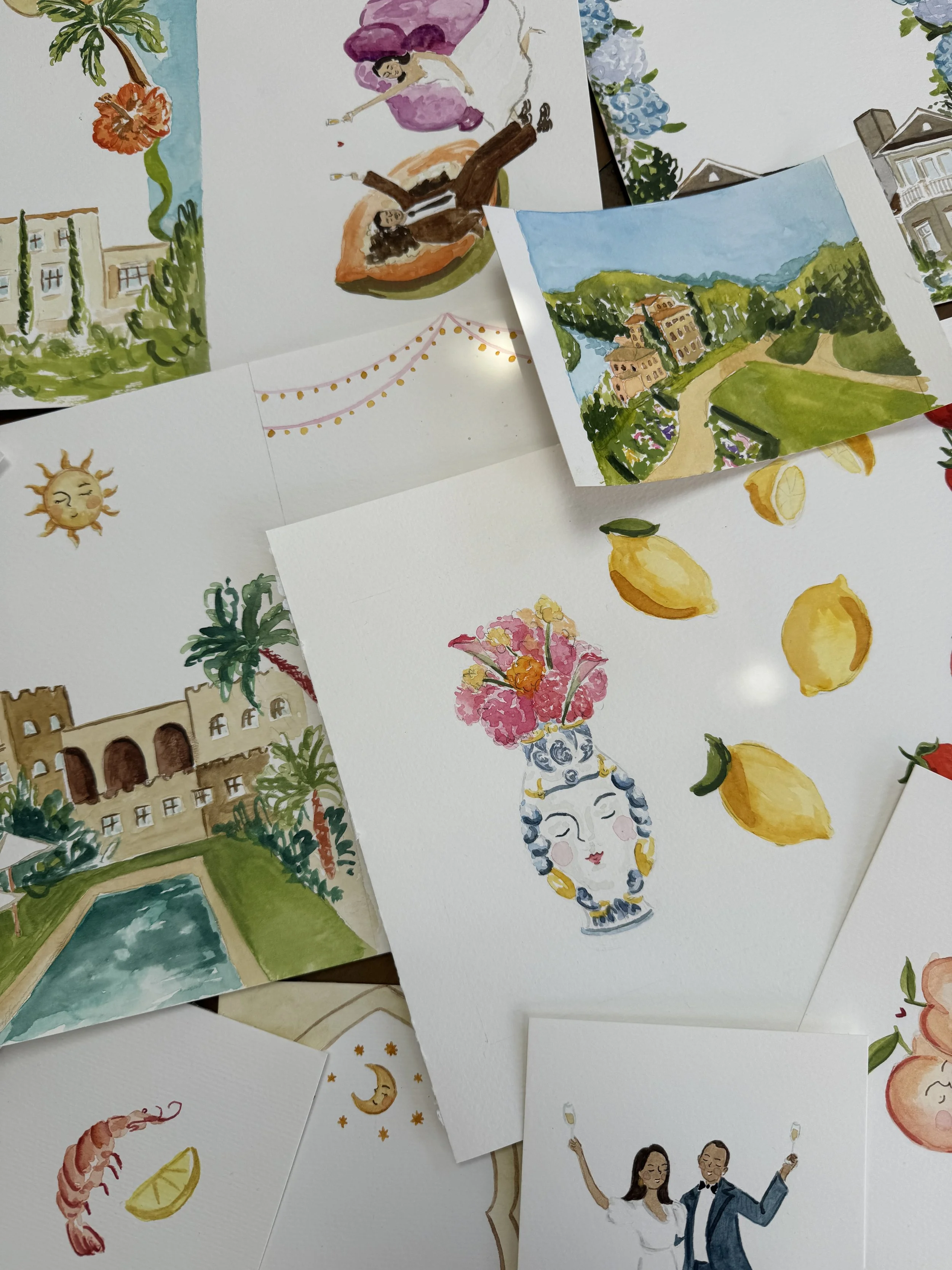 You will receive up 10 hand-painted stationery designs which can include both Before the Day and On the Day items (save the dates, invitations, menus, singage etc.)